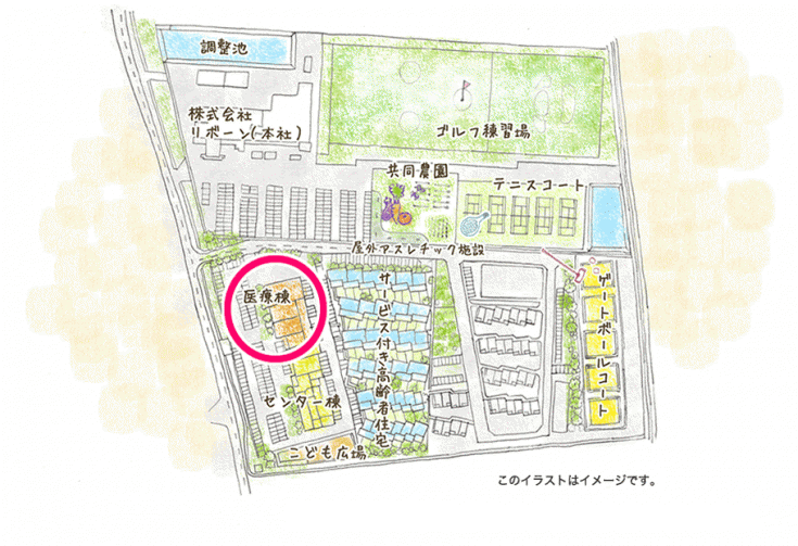 『だいにちスローライフビレッジ』は、1万坪に及ぶ広大な敷地内に、住居棟(サービス付き高齢者向け住宅)、調剤薬局(予定)を備えた医療棟、コンビニエンスストア、フードコート・レストラン・パン工房などが並ぶセンター棟、ゴルフ練習場、テニスコート、ショートステイ施設等があり、住居棟の住民の方々はもちろん、周辺地域からも施設利用する人が集まる魅力あるビレッジです。