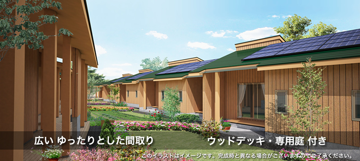 | 戸建て感覚の専用庭 | ウッドデッキから四季を味わう、土のある暮らし・・・ ガーデニングや家庭菜園も行える十分な広さです。 世帯用Ⅰ/38.1㎡(約11.5坪) 世帯用Ⅱ(単身併用型)/32.7㎡(約10坪) |