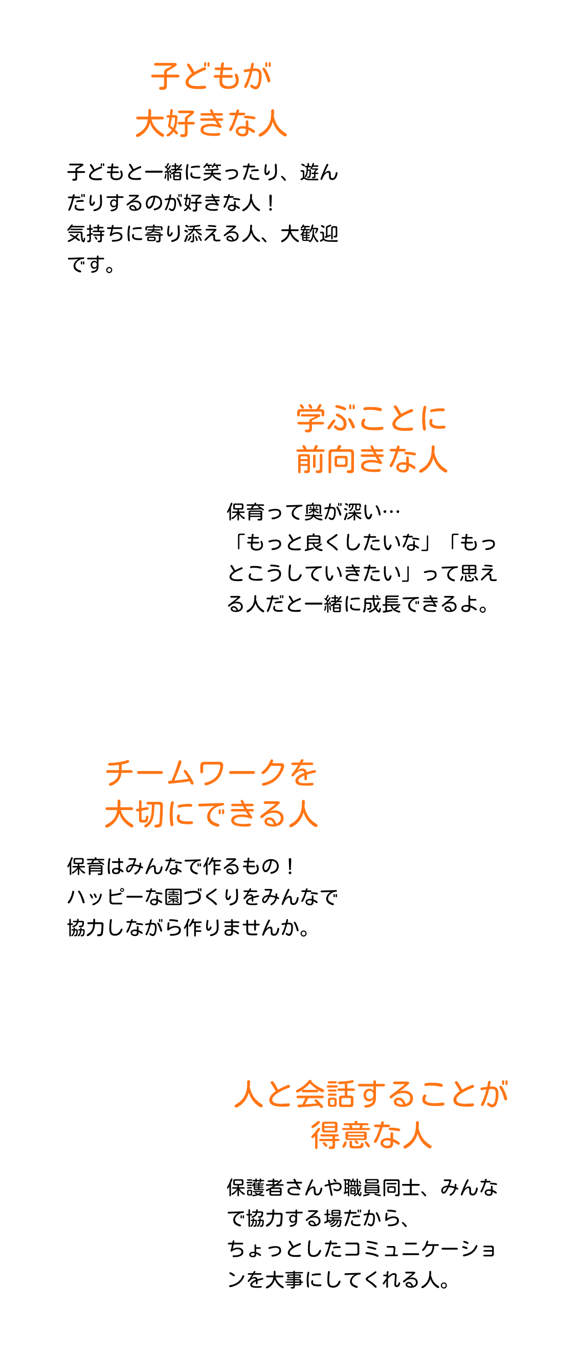 子どもの人数が多いからこそできる活動や行事があり、たくさんの子どもたちとの関わりが新しい発見や自分自身の成長にもつながっています。ぜひ、一緒に働きませんか。